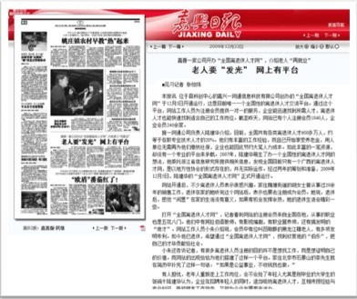 记者张怡炜在嘉兴日报b2版发表《老人要“发光”网上有平台》一文。该文对网站的发展状况进行了详细介绍,记者结合了社会老龄现状,对“全国离退休人才网”建站及发展给予了充分肯定与高度评价。